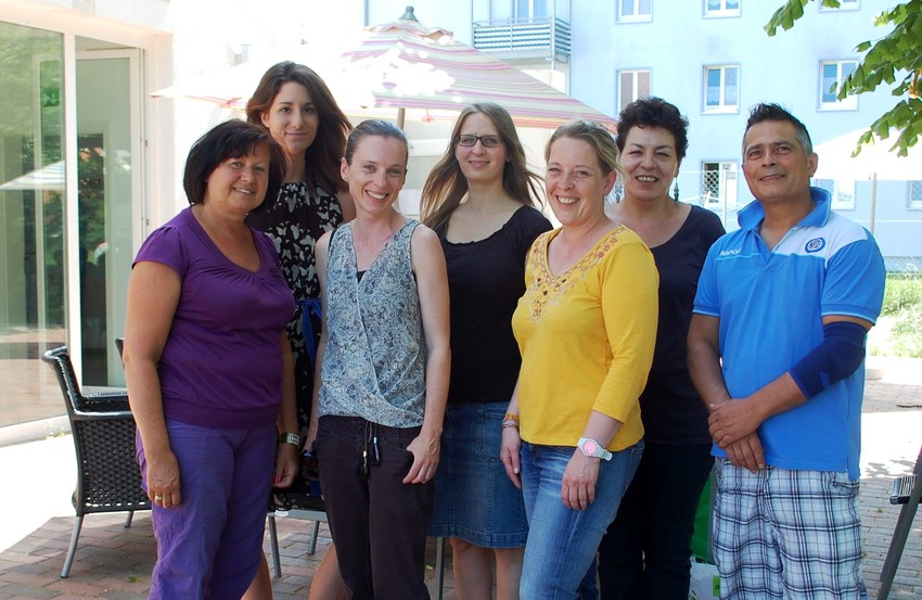 Um Fachaufsicht Friederike Appold (3.v.r.) und Projektleiterin Maria Beiderbeck (3.v.l.) gruppieren sich die weiteren Mitarbeiter des Bürgerhaus-Teams (v.l.n.r.): Christa Kraus, Stephanie Hofmeier, Maria Luise Weber, Anna Fuso-Meier und Gioacchino Acierno.