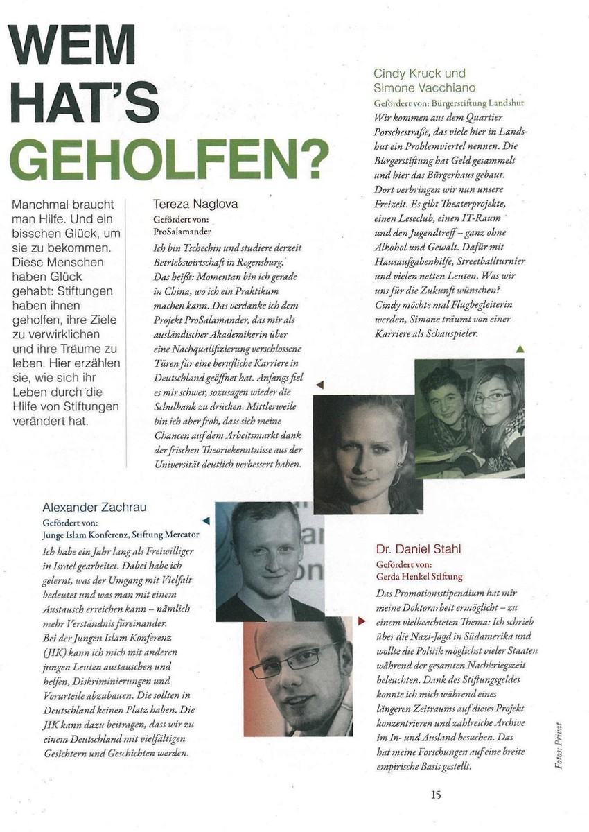 Am Beispiel von Cindy Kruck und Simone Vacchiano lobt das ZEIT-Magazin Stiftungen in seiner Ausgabe vom Dezember 2013 die sinnvolle Arbeit der Bürgerstiftung Landshut im Bürgerhaus.