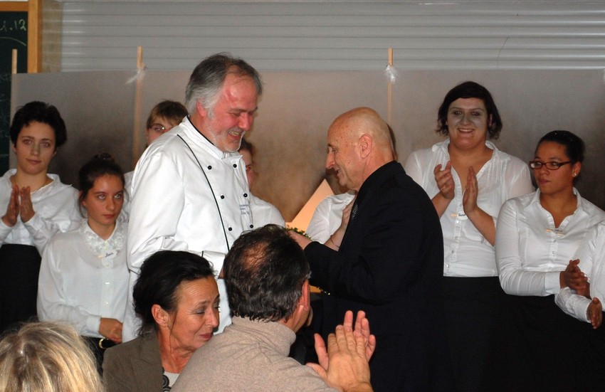 Stifterdinner 1: Oberbürgermeister Hans Rampf überreichte als Dank für den gelungenen Abend Buchskranzl an alle Mitwirkenden, hier an Alois Vogl, der von der Küche aus das ganze Dinner kulinarisch und logistisch leitete.