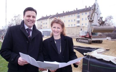 Das im Rohbau befindliche Bürgerhaus Landshut bekommt eine besonders umweltfreundliche Heizung: Der Geschäftsführer von ebm-papst Landshut, Stefan Brandl, hat bei einem Baustellenbesuch am Auerweg die grüne Brennwerttechnik erläutert.