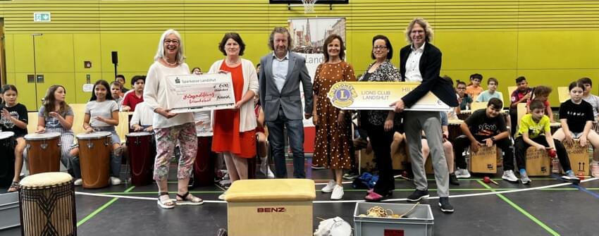 Trommelschüler in Aktion; Personen von links nach rechts: Barbara Beddrich (Bürgerstiftung Landshut), Monika Böhm (Schulleitung), Florian Schneider (Lions Club), Edith Angulanza (Klassenleitung), Andrea Moratscheck (Schulleitung), Prof. Dr. Thomas Küffner (Lions Club/Bürgerstiftung Landshut)