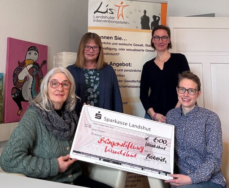 Die Bürgerstiftung Landshut unterstützt die Arbeit der Landshuter Interventions- und Beratungsstelle für häusliche und sexualisierte Gewalt mit einer 500 €-Spende. Die Übergabe erfolgte in den Beratungsräumen der Institution, Seligenthaler Straße 16, Landshut, die paritätisch von der AWO und der Caritas Landshut getragen wird.